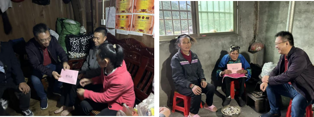 座谈会后,黄坚达带领考察组深入村民家中进行走访,并对困难群众发放慰问金。每到一户,黄坚达都与村民亲切交谈,询问他们的身体健康状况、家庭收入来源、子女教育等情况,认真倾听他们在生产生活中遇到的困难和问题,以及对未来发展的想法和诉求,鼓励村民坚定信心,克服困难,通过自身努力创造更加美好的生活。